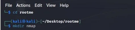 After successfully setting up the connection and deploying the machine, proceed to create a directory (rootMe) for your CTF machine on the Desktop, and another directory specifically for Nmap.