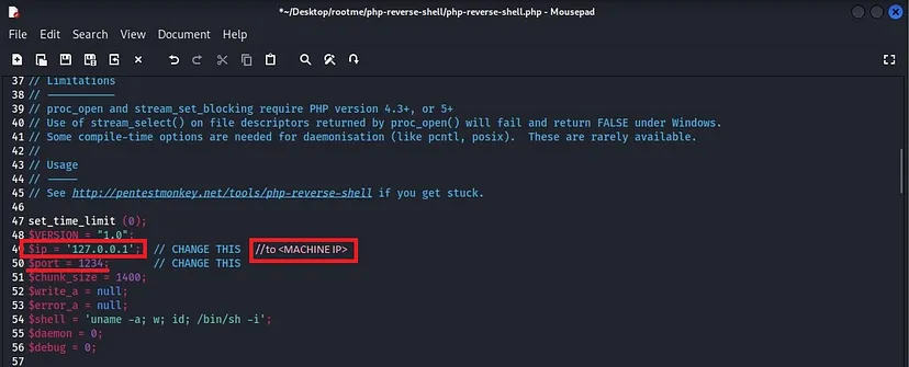 Now open the script in editor and change the $ip and $port to your host machine’s IP and port you want to listen on. Here i am keeping the default port which is “1234”.