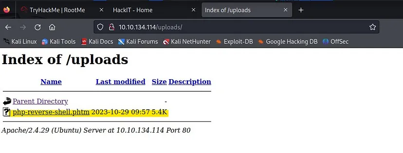 Now we have to gain shell by executing the uploaded script in the <MACHINE-IP>/uploads/ .