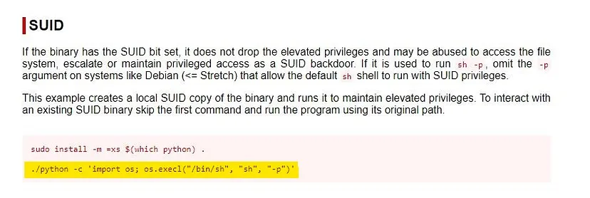 Now we will try to escalate our privileges. Lets go to https://gtfobins.github.io/ and look for possible privilege escalation commands for elevating the privileges.